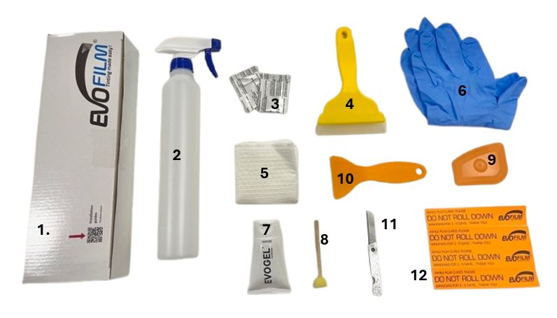 1. Työkalupakki 2. Suihkepullo 3. Asennusneste 4. Lastain 5. Mikrokuituliina 6. Suojahanskat 7. Asennusgeeli 8. Sieniharja 9. Pyöristetty kaavin 10. Spatula 11. Veitsi 12. Tarrat ikkunannostimille